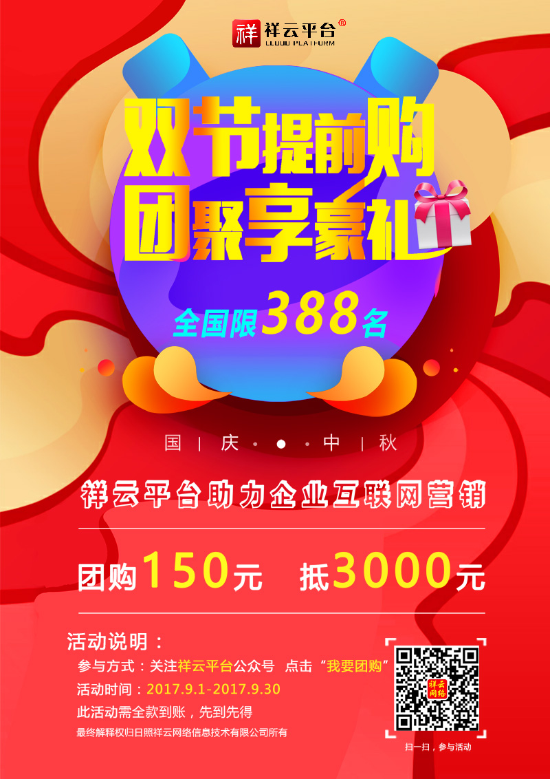 迎中秋,慶國慶,值此雙節(jié)來臨之際,祥云網(wǎng)絡(luò)助理企業(yè)互聯(lián)網(wǎng)營銷,團(tuán)購150元抵3000元。活動進(jìn)行中……